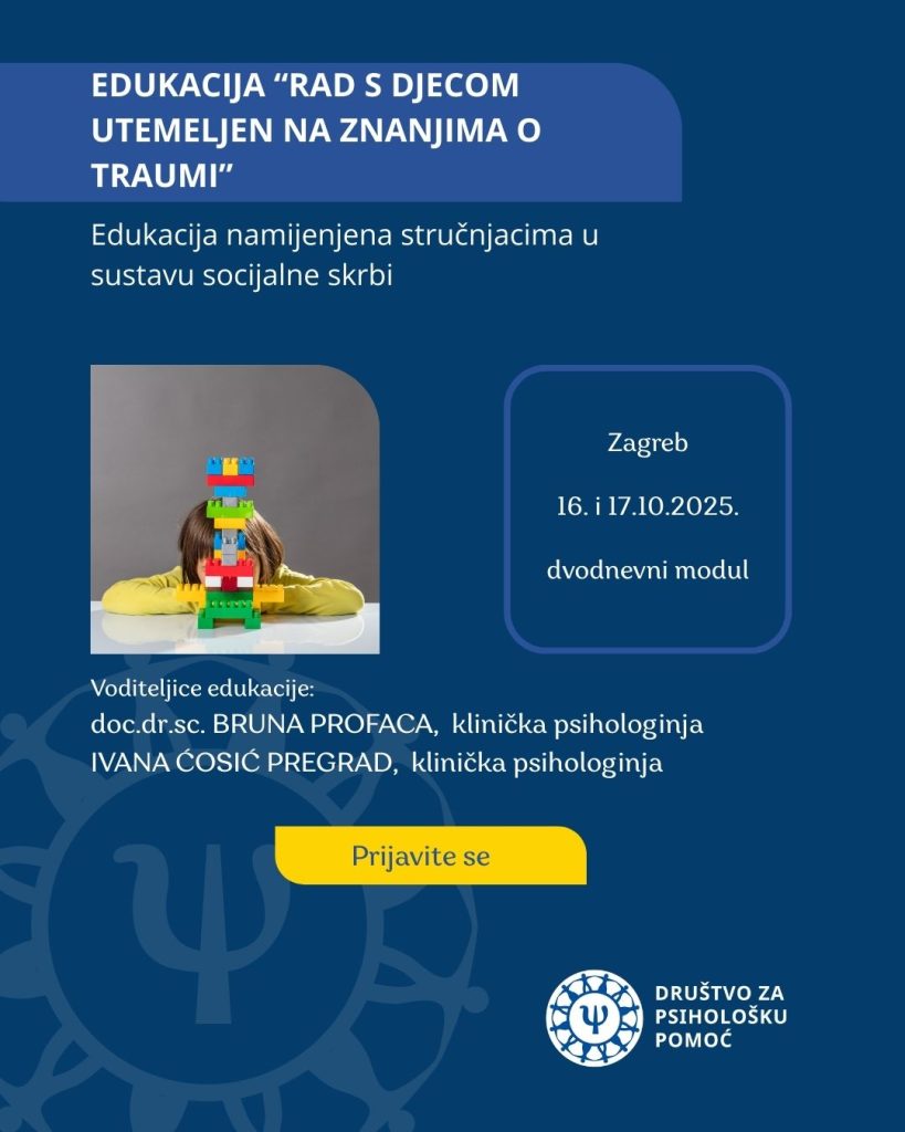 Pozivamo zainteresirane stručnjake da se prijave na edukaciju “Rad s djecom utemeljen na znanjima o traumi Društva za psihološku pomoć” koju će voditi doc.dr.sc. Bruna Profaca, klinička psihologinja i Ivana Ćosić Pregrad, klinička psihologinja.